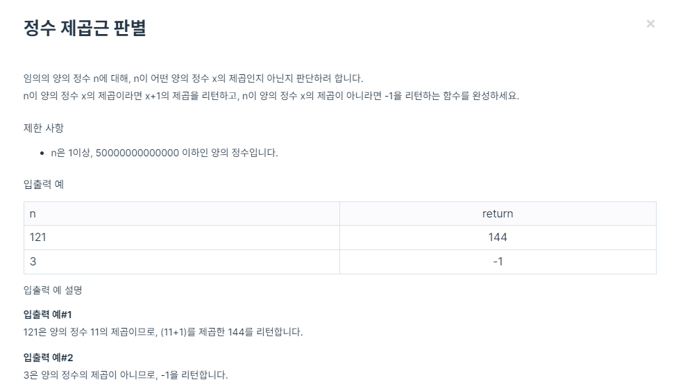 if sqrt * sqrt == n: # n이 정수였으니 얻은 제곱근을 다시 제곱하면 원래 값 n이 나올것