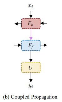 - Coupled propagation scheme은 inter-connected되었다. Backward로 propagated된 features가 forward propagation module의 input으로 들어간다
