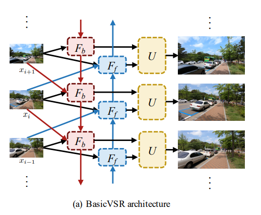 - BasicVSR에서는 두 반대 방향이 독립적이다. 각 propagation branch의 features는 서로 다른 정보들로 계산된다