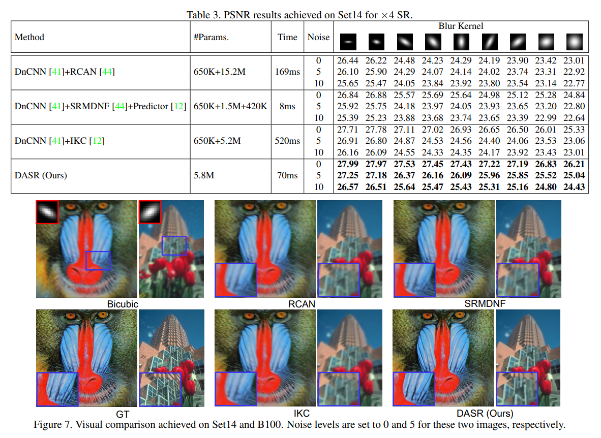 이전 multiple degradations을 위한 SR network는 보통 degradation representations를 이미지 features와 concat해서 CNN에 입력으로 넣었습니다. 하지만 degradation representations와 이미지 features의 domain gap 때문에 이를 바로 convolution 처리하는 것은 좋지 않습니. 이와 다르게 DASR은 degradation representation을 기반으로 convolution kernel과 modulation coefficients를 예측하는 방법을 학습함으로써, 특정 degrdation에 적응하기 위한 degradation 정보를 잘 활용할 수 있습니다.
