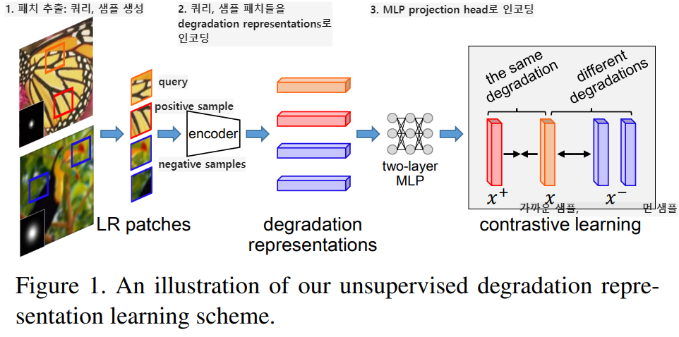 Degradation representation learning의 목표는 unsupervised 방식으로 LR이미지에서 discriminative representation을 추출하는 것입니다. Fig 1.은 contrastive learning frame를 나타낸 그림이며 논문에서는 하나의 이미지 내의 degradation은 동일하고 다른 이미지와의 degradation은 다르다고 가정합니다.
