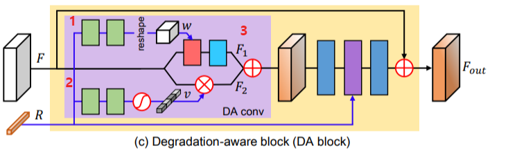 추출된 degradation representations는 DA convolutions와 합쳐져서 convolution kernels와 channel-wise modulation coefficients를 예측해 다양한 degradation에 대한 adaption을 얻는다.