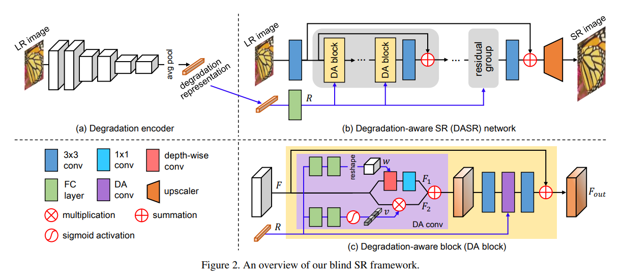 논문의 blind SR framework는 degradation encoder와 degradation-aware SR network로 구성됩니다.