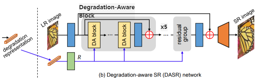 DASR은 5개의 residual groups으로 이루어져 있으며 각 그룹은 5개의 Degradation-aware block(DA block)들로 구성됩니다.