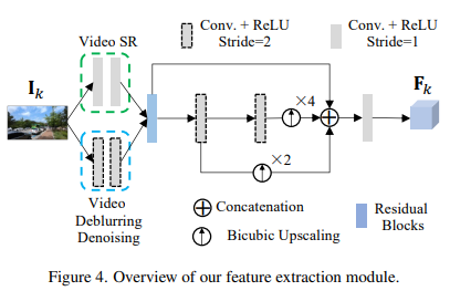 먼저 RGB frame $I^{lq}_k$를 고차원의 피처맵 $F_k$로 만들어야 한다. Deblurring, Denoising의 경우 먼저 2개의 convolution(stride=2)로 feature의 resolution을 downsample하며 SR은 크기를 유지한다. 그 다음 2개의 convolution을 통해 input의 pyramid representation을 얻는다. 마지막으로 하나의 convolution을 통해 합친다.