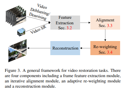 여러 프레임들의 디테일은 유지하고 에러는 없애서 모으는 Aggregation역시 중요한 과정이다. 지금까지의 restoration systems는 sequential convolutions를 사용하여 바로 합치거나 spatial-temporal한 적응형 aggregation방법들을 사용한다(attention). 하지만 이는 모두 learned parameters에 기반하며 특정 도메인에 오버피팅될 위험성이 존재한다. 본 논문에서는 non-parametric re-weighting module을 제시한다.