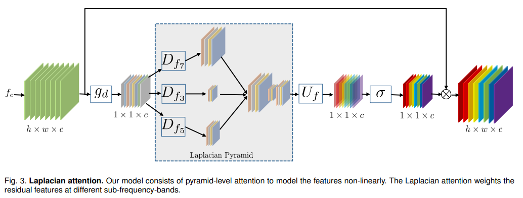 DRLM은 세가지 요소로 구성되어 있다: densely connected residual blocks unit, compression unit, Laplacian pyramid attention.