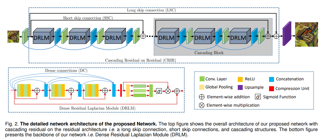 이전 SISR 알고리즘들은 깊은 네트워크 구조와 오랜 훈련시간이 필요했다. 더불어 SR을 위한 CNN은 multople scales에서의 feature를 이용하지 못했으며 같은 weight를 가지게 하였다. Densely Residual Laplacian Network (DRLN)는 residual 구조에서 cascading residual을 사용하여 low-frequency flow가 high, mid-level features의 기능을 학습하는 데 집중할 수 있도록 한다. 더불어 denslely concatenated redisual blocks는 high-level complex features를 학습하는데 도움을 준다. 또한, feature map 사이의 inter and intra-level dependencies를 학습하기 위한 Laplacian attention을 제안한다.
