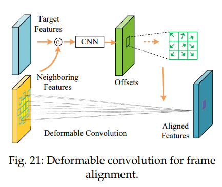 Deformable convolutional network는 Dai et al.[1]이 처음으로 제안하였다. 보통 CNN은 kernel의 위치가 고정되어 있기 때문에 geometric transformation modeling에 한계점이 있다. Deformable convolution은 이 한계점을 넘을 수 있다. 그림은 feature alignment를 위한 deformable convolution을 표현한 그림이다. Target feature maps는 neighboring feature maps와 concat되고 projected되어 추가의 convolutional layers를 통해 offsets를 얻는데 사용된다. 얻은 offsets는 원래의 convolution kernel에 적용되어 deformable convolution kernel이 되어 input feature에 적용되어 output feature를 만드는데 사용된다.
