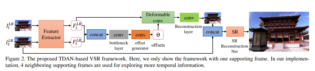이전의 VSR methods는 보통 reference frame과 supporting frame사이의 optical flow를 구한 후 이를 사용해 supporting frame을 warp하여 temporal alignment를 한다. 하지만 부정확한 flow와 iamge-level warping은 warped supporting frames에서 부적절한 artifacts를 유발한다. 이를 해결하기 위한 temporal-deformable alignment network (TDAN)은 optical flow를 사용하지 않고 reference frame과 supporting frame을 feature level에서 적응형으로 align한다. 이는 refrence frame과 supporting frame의 features를 통해 예측한 offsets으로 다양한 커널을 만들어 할 수 있다.