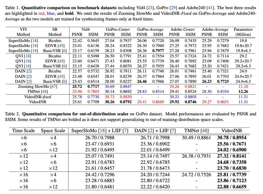 대부분의 고화질 비디오는 저장하는데 많은 자원이 소모되기에 낮은 해상도와 프레임 레이트로 저장된다. 하지만 최근 temporal interpolation과 spatial super-resolution을 통합한 Space-Time Video Super-Resolution (STVSR) 프레임워크를 통해 이 문제를 해결하고 있다. 그러나 대부분의 STVSR은 고정된 업샘플링 비율만 지원하기 때문에 제약이 있다. 본 논문은 이에 대한 대응책으로 Video Implicit Neural Representation (VideoINR)을 제안하고 이를 STVSR에 적용하였다. 학습된 INR은 비디오를 임의의 해상도, 프레임 레이트로 디코딩할 수 있다.