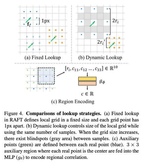 $r_i$가 업데이트되면서 범위가 커지면 blindspot이 생길 수 있다(그림 4(b)). 이를 완화하기 위해 region encoding을 제안한다. 사용하려는 그리드 위치를 중앙으로 두고 주위에 3x3크기의 보조 포인트를 정의한다. 이 후 encoding function $g_{θ}$를 두어 각 보조 포인트가 하나의 correlation value를 가지게 한다.