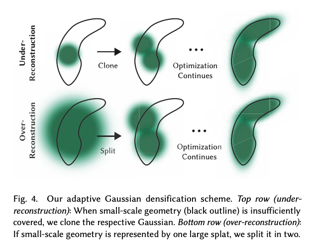 - 해결책은 새로운 형태를 만들기 위해 기존의 가우시안을 복제하고, 이를 positional gradient의 방향으로 이동시키는 것이다.