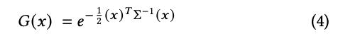 - $G(x)$: 가우시안 함수 값으로, 3차원 공간 내의 어떤 점 x에 대한 분포의 '밀도'를 나타낸다. 이 밀도는 점 x가 분포의 중심에서 얼마나 떨어져 있는지에 따라 달라진다.