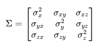 이방성 공분산 행렬의 예 - $σ_x^2$, $σ_y^2$, $σ_z^2$는 각 축에 따른 분포의 '폭'을 나타내지만, 이 값들이 서로 다를 수 있다.