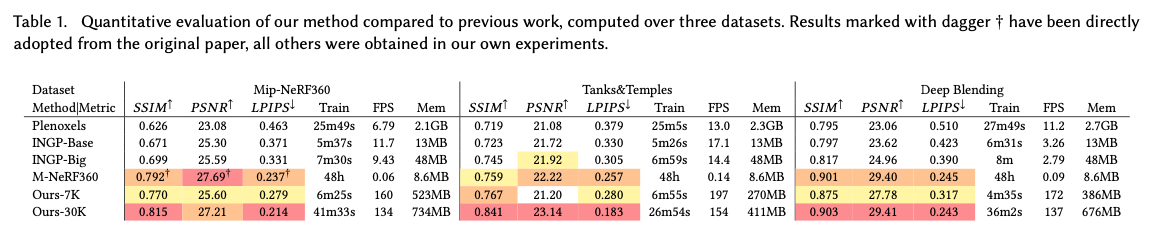 3) 빠른 렌더링 기술: 새로운 방법으로 장면을 빠르게 그려내어, 학습 시간을 단축시키고 실시간으로 화면에 표시할 수 있게 한다.