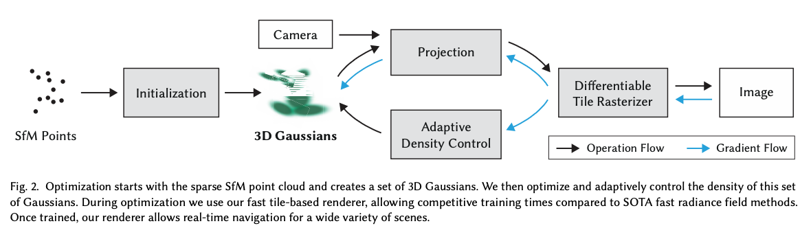SfM(Structure from Motion)에서 얻은 희소한 점들로부터 시작하여 Gaussians의 수를 적응형으로 조절하여 unit volume에 대한 밀도(density)를 제어한다.
